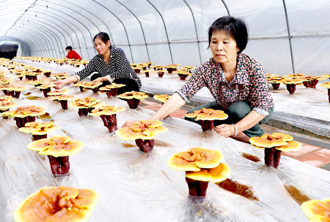 图为该县吴家店镇吴畈村村民近日在“药光”互补产业基地的大棚里管护灵芝